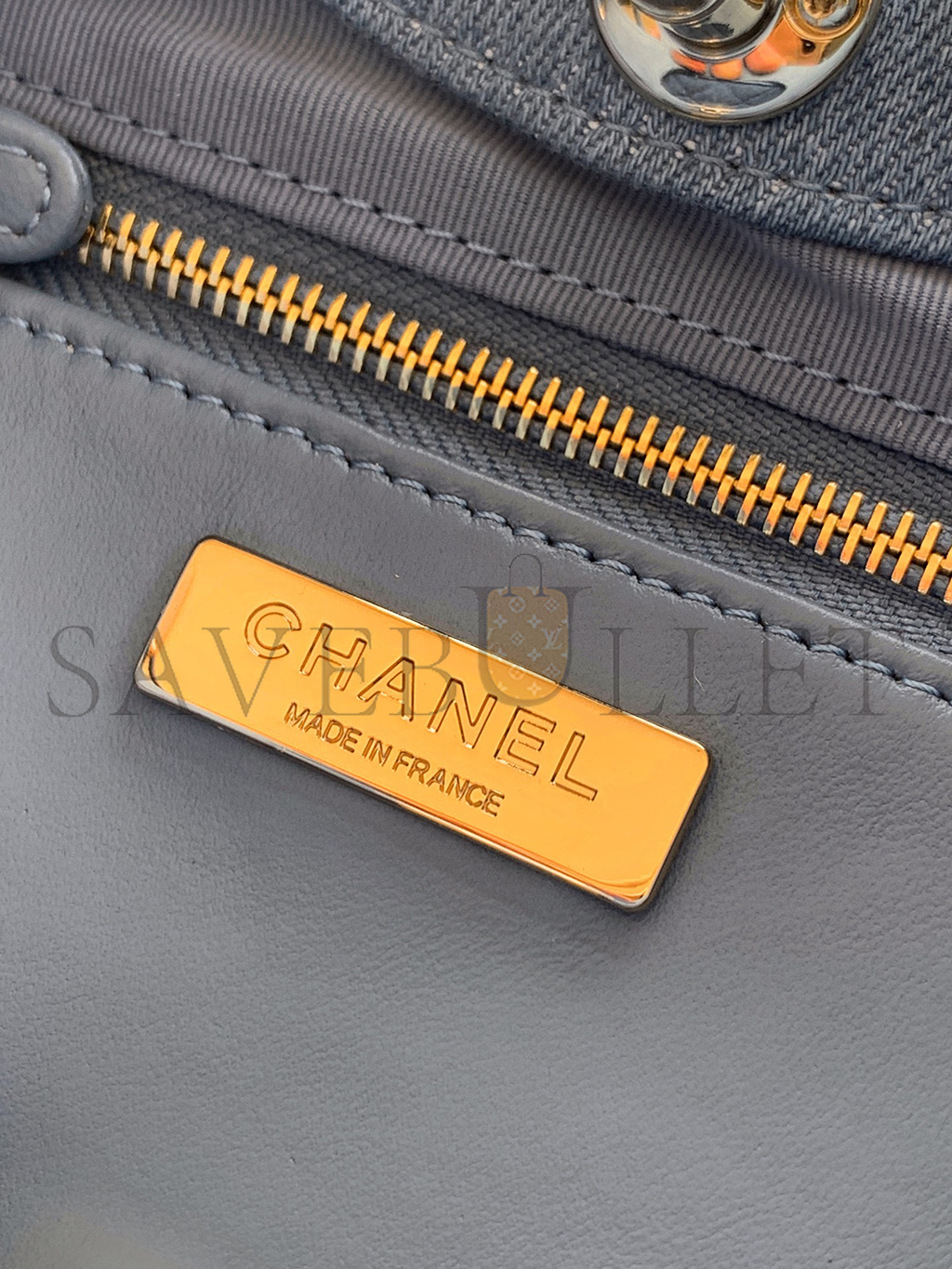 Denim bouclé shoulder bagShoulder strap with adjustable press studOne main compartmentZippered closureColor: Navy-White-SpaceHardware: Brass finishPro..