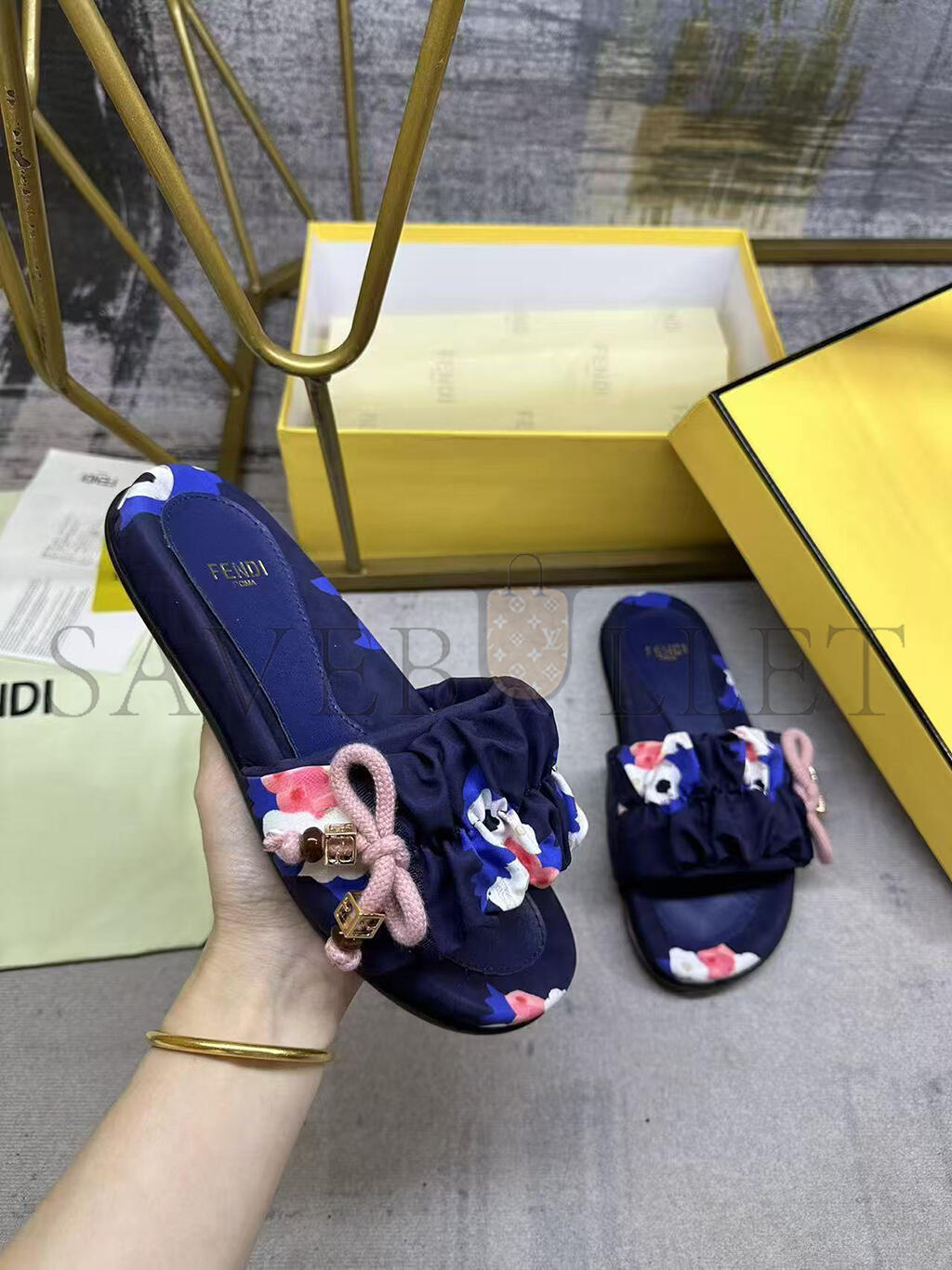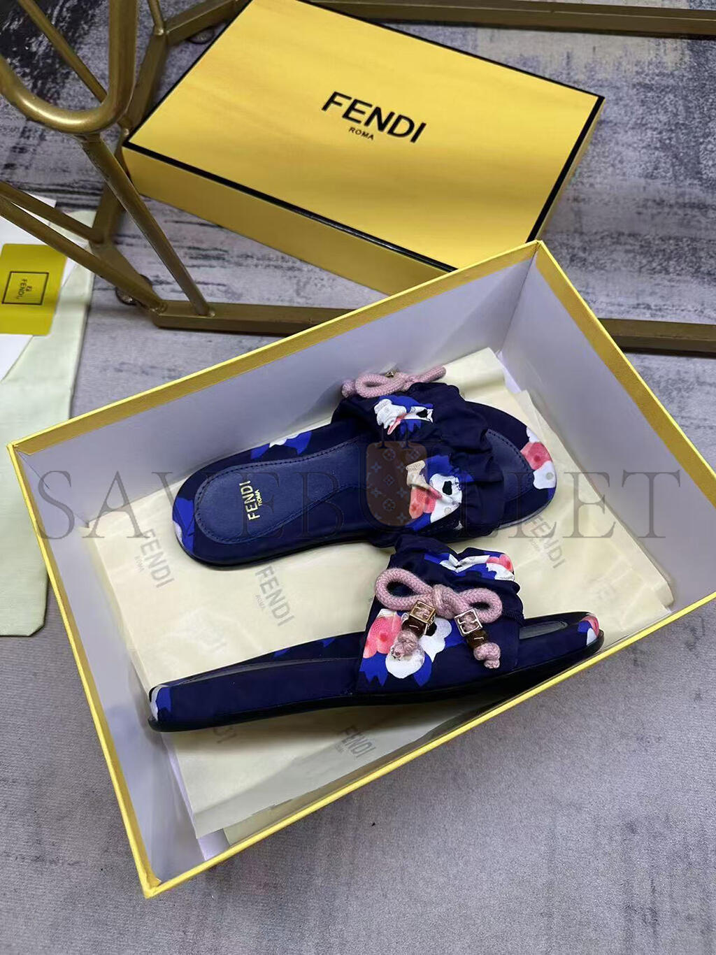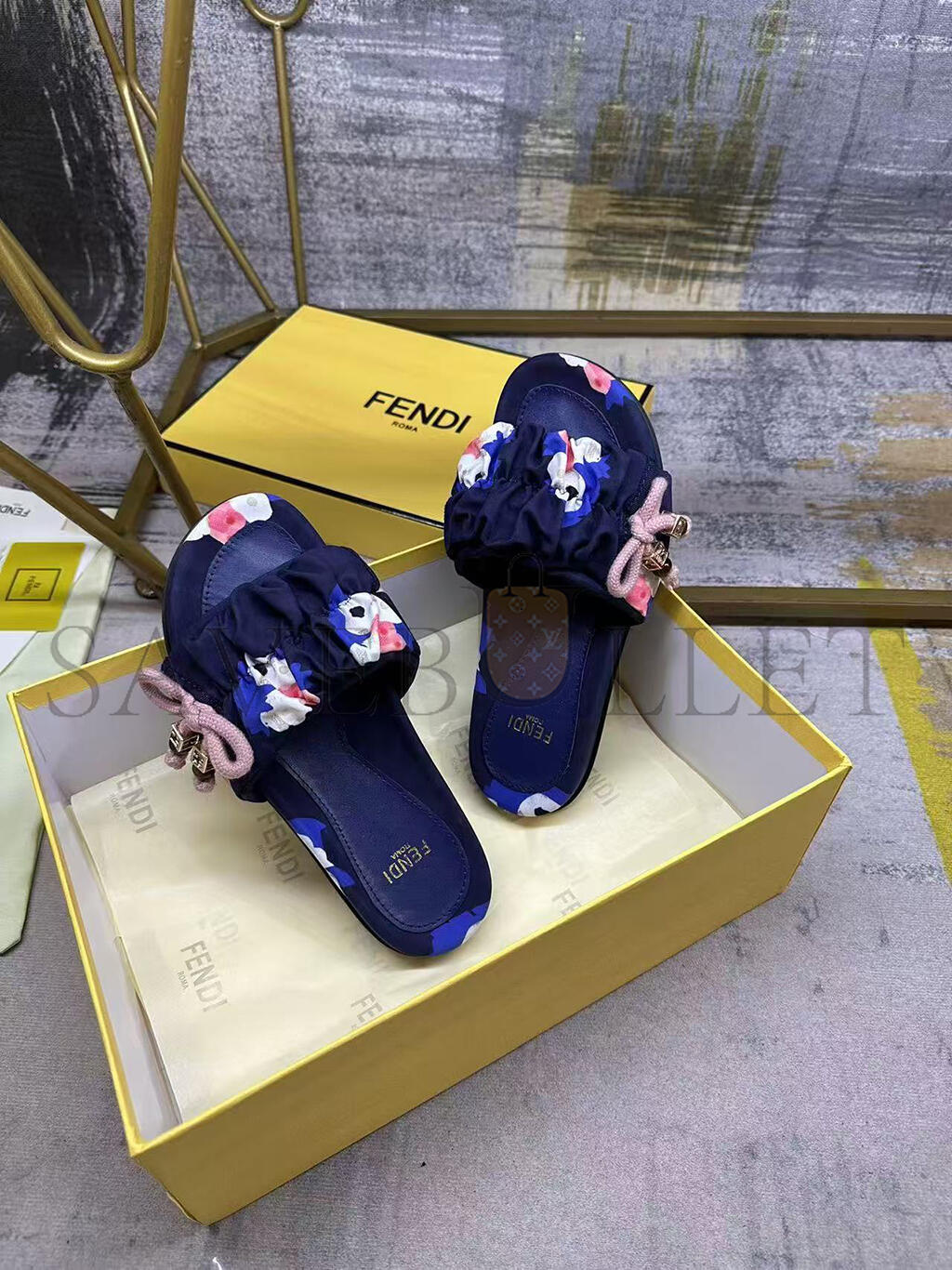 Wide-band flat slides. Made of FF jacquard satin with Fendi Bouquet print in green, black, blue and pink. Decorated with a gathered bow and pink braided ribbon drawstring. Brown resin-effect beads and square gold-coloured metal element with FF motif.