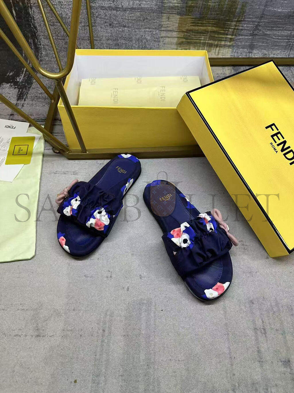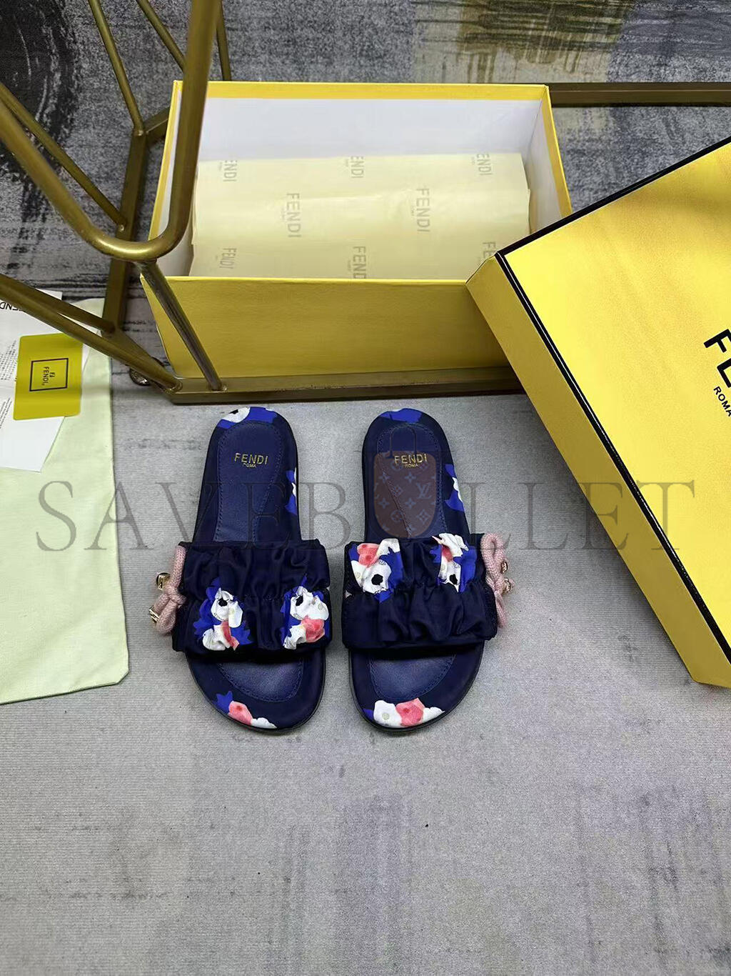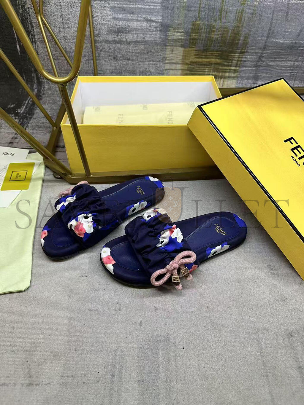 Wide-band flat slides. Made of FF jacquard satin with Fendi Bouquet print in green, black, blue and pink. Decorated with a gathered bow and pink braided ribbon drawstring. Brown resin-effect beads and square gold-coloured metal element with FF motif.
