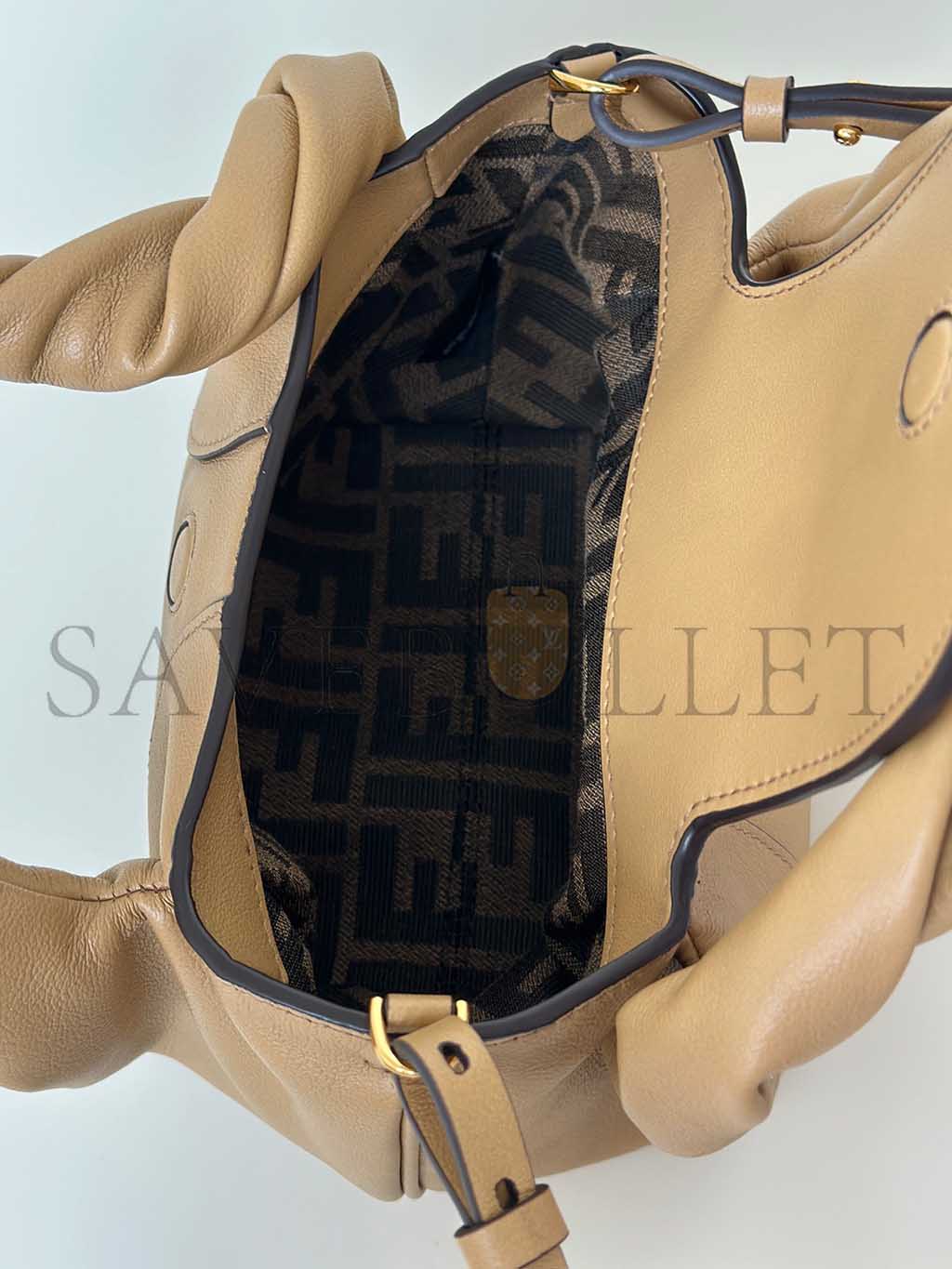 Featuring a tobacco-brown FF jacquard fabric-lined internal compartment and gold-finish metalware.
