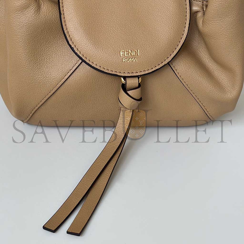 Rounded flap with clasp and knotted tie in tone-on-tone leather. Gold-coloured hot-stamped FENDI ROMA logo.