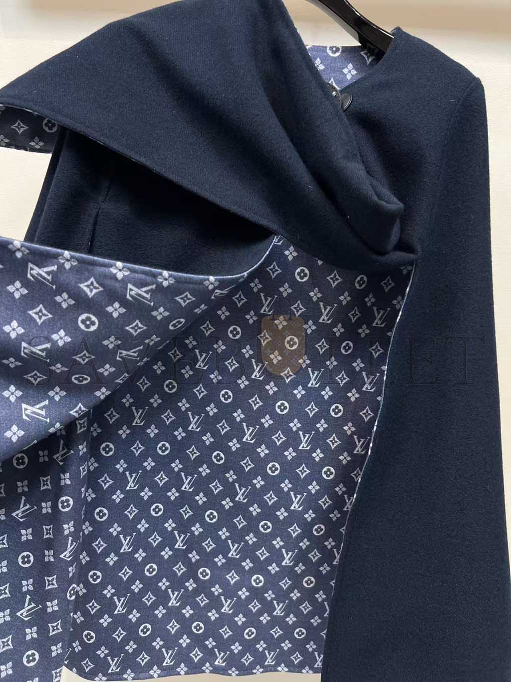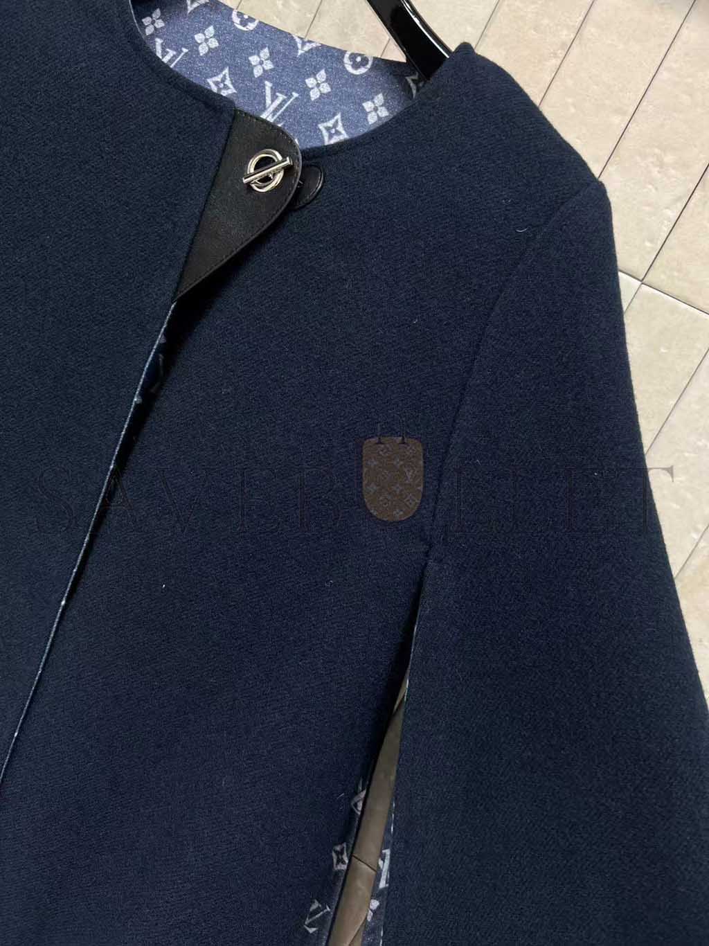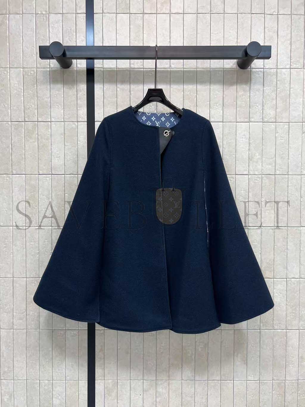 This cape coat has a refined air in double-face wool enriched with a hint of cashmere and silk. The sharp silhouette is detailed with slits for ease of movement, which reveal a glimpse of the tonal Monogram jacquard on the inside. The neckline is fastened with a contemporary chain detail trimmed with a lambskin leather tab.