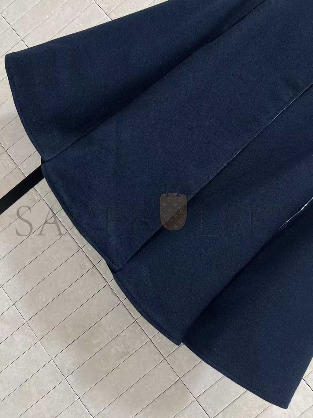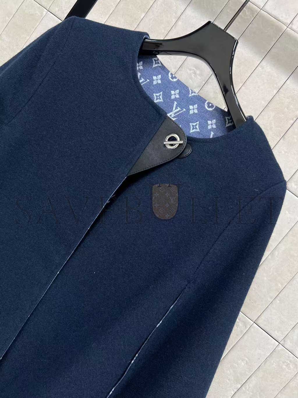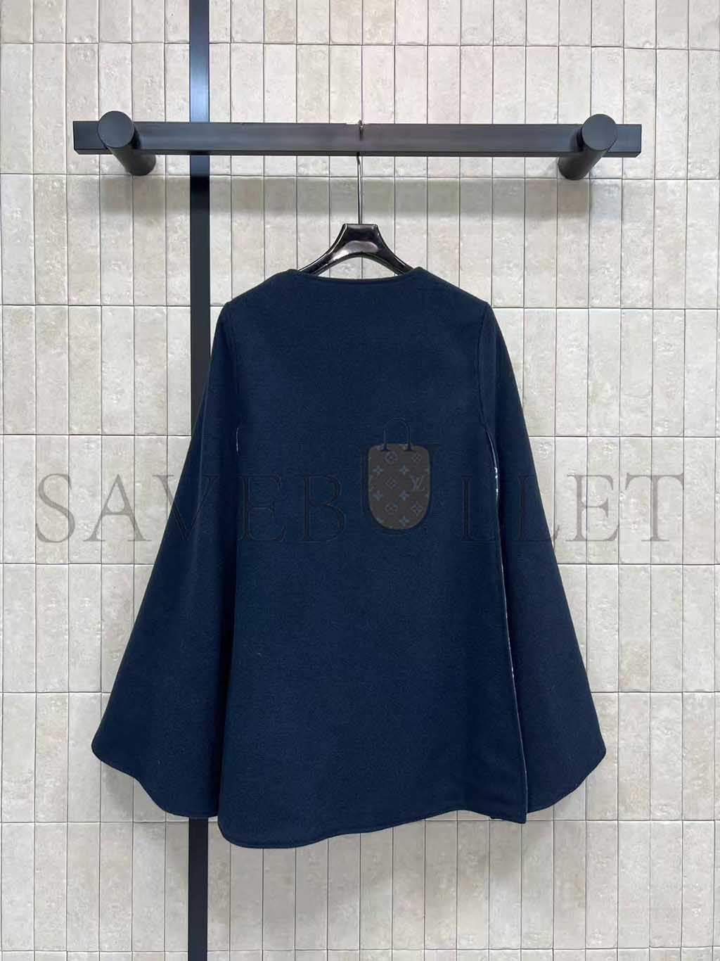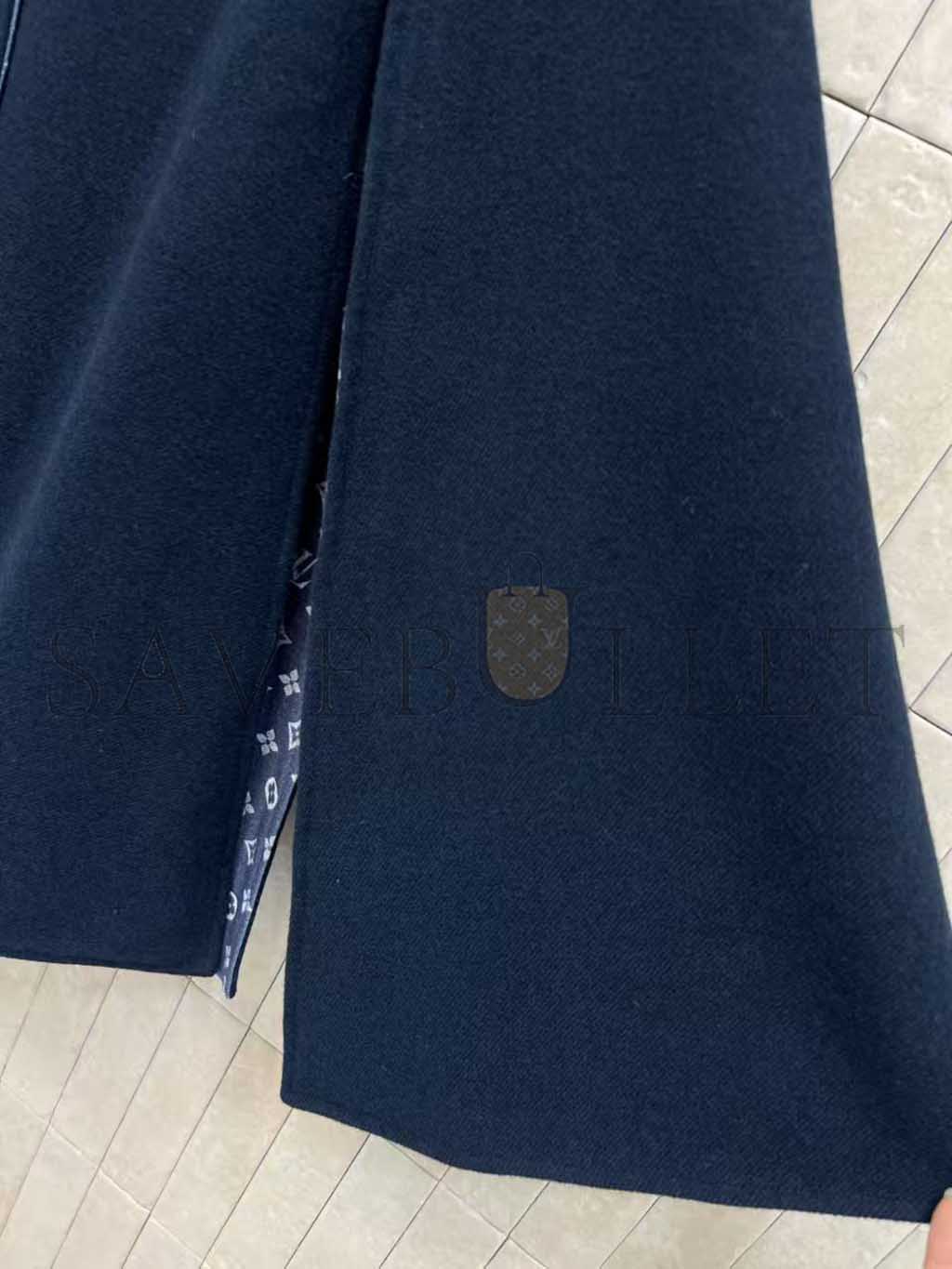 This cape coat has a refined air in double-face wool enriched with a hint of cashmere and silk. The sharp silhouette is detailed with slits for ease of movement, which reveal a glimpse of the tonal Monogram jacquard on the inside. The neckline is fastened with a contemporary chain detail trimmed with a lambskin leather tab.