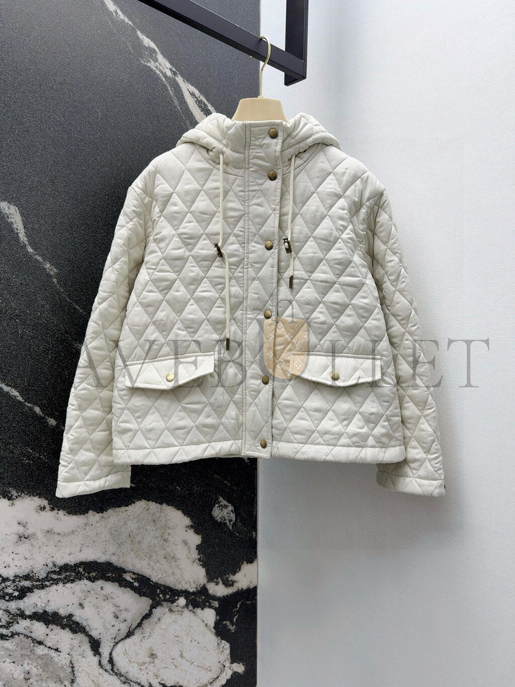 Quilted jacket in lightweight nylon with a classic fit and drawstring hood. Cropped silhouette lined in cotton twill with a Burberry check pattern in our signature sand beige color.