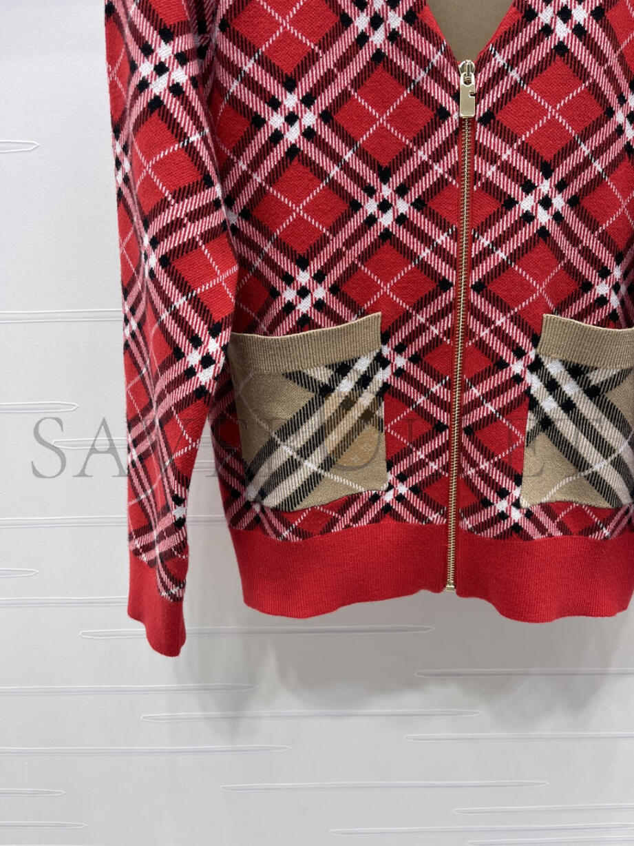 Cardigan in cozy wool, knitted in the Burberry Check pattern in our seasonal Crayon Red. V-neck style. Contrasting pockets in our signature Sand Beige hue and B-shaped zip pulls complete the design