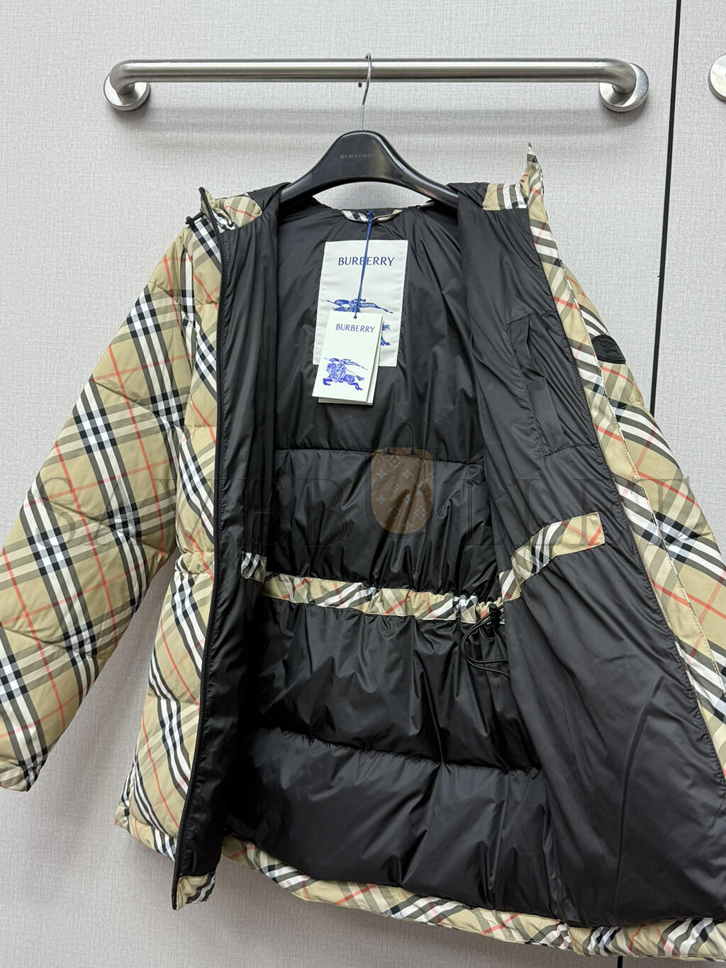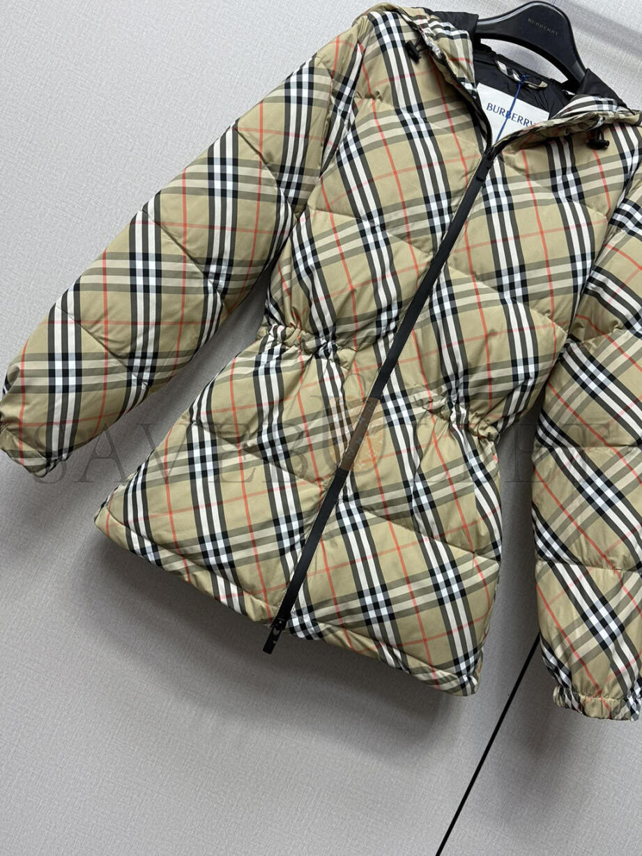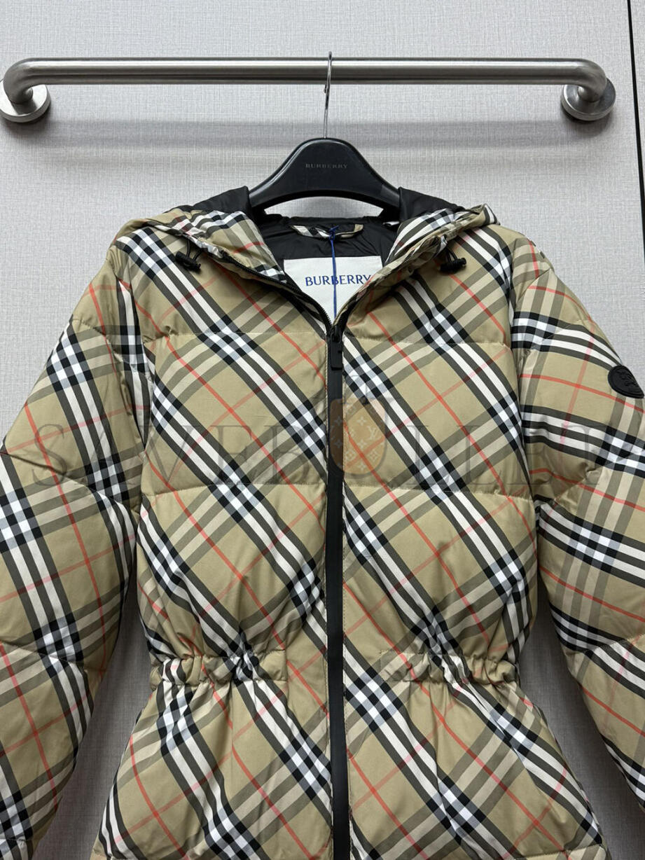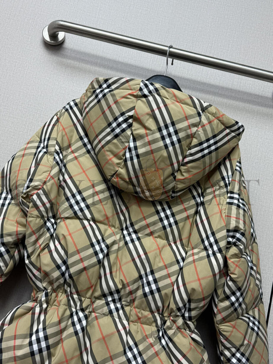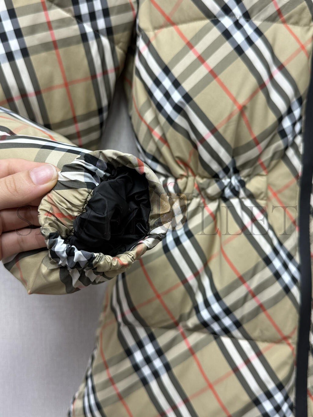 Padded hooded jacket in our signature Burberry Check pattern. Classically tailored design with a drawstring waist to define the silhouette. Finished with B-shaped zip pulls and our Knight Stamp – an archival knight motif in a stamped style, first seen on Burberry bags in the 1980s.
