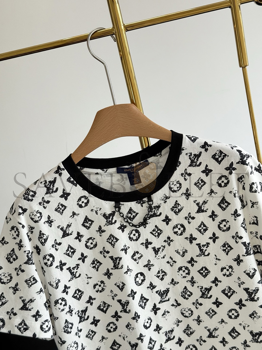 This staple T-shirt is refreshed for the season in soft cotton jersey featuring an allover print of the collection’s Pop Art-inspired Monogram motif for a casual graphic look. The contrasting neckline introduces a sporty accent, while an LV chain embellishment adds a final House touch.